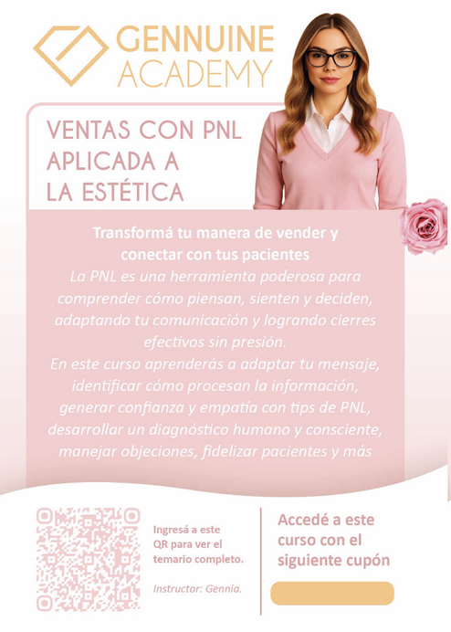 Este curso fue diseñado especialmente para profesionales de la estética y la salud que quieren vender con más confianza, sin forzar, usando herramientas prácticas de la Programación Neurolingüística (PNL).