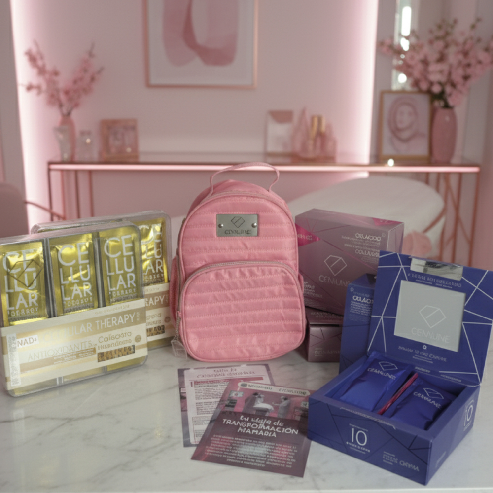¡Kit Post-Cirugía Gennuine con Antiage y Defense Premium y Gold NAD (4 meses de soporte) para una cicatrización y recuperación óptima. Incluye mochila térmica y guía de cuidado integral.