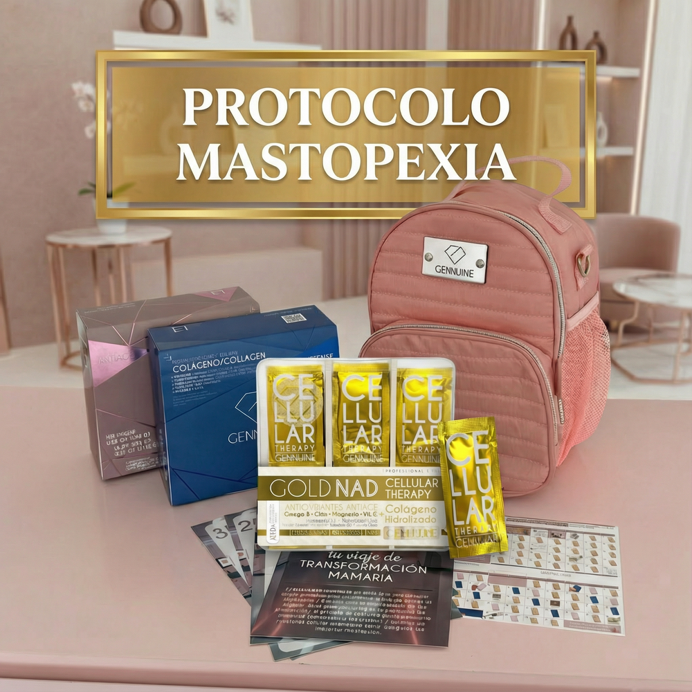 ¡Kit Post-Cirugía Gennuine con Antiage y Defense Premium y Gold NAD (4 meses de soporte) para una cicatrización y recuperación óptima. Incluye mochila térmica y guía de cuidado integral.