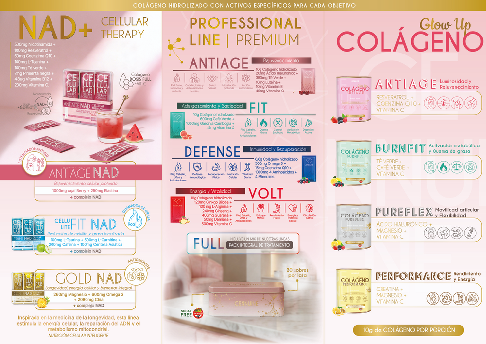 Folleto linea Professional Line latas, NAD, Minibar, Classic, GlowUp especialmente para esteticas.